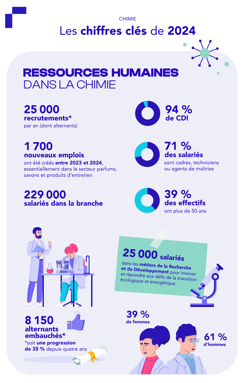 Combien d’emplois créés ? Quelle place pour l’alternance ? Qui sont les salariés de la Chimie aujourd’hui ? Chaque année, France Chimie dévoile les données essentielles du secteur. Voici ce qu’il faut retenir de 2024 : entre croissance, transformation et attractivité renouvelée.